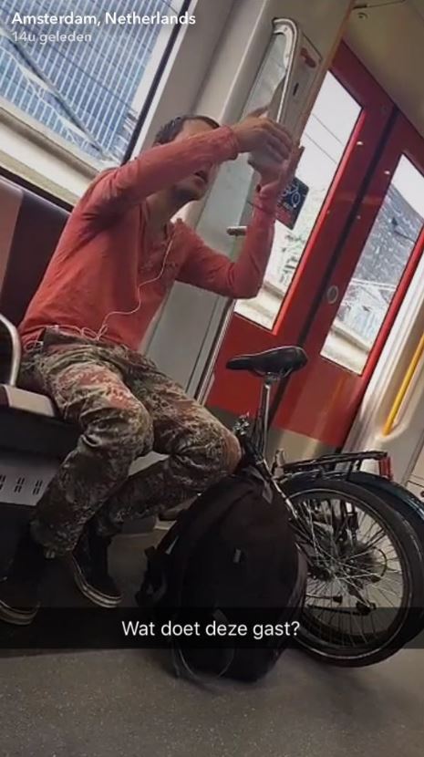 Vlakbij, daar bij zo’n blauw, vaag bolletje, zit ook iemand op Snapchat die daar iets heeft laten zien van zichzelf. Ik kan daarop klikken en dan zie ik dat die persoon zich niet alleen toont aan zijn vrienden, maar voor iedereen te zien is. Ik ken die persoon helemaal niet. Maar ik kan wel zien wat hij gesnapt heeft. In de metro. Dit, een vreemde passagier in de metro, die ook niet door had dat hij gesnapt werd, maar wel uitgezonden is over de hele wereld: