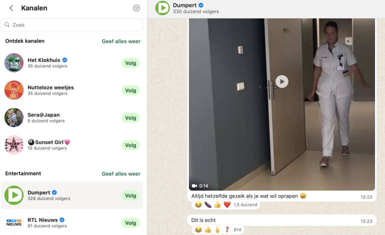 - Er zijn allerlei kanalen die niet bepaald kindvriendelijke content plaatsen. Een goed voorbeeld is Dumpert, waar regelmatig gewelddadige en seksistisch getinte filmpjes voorbijkomen. Maar er zijn ook alweer allerlei influencers actief via kanalen. In het Jeugdjournaal gaf een meisje aan ‘wel iets van 200’ kanalen te volgen. Ofwel: je denkt als ouder dat je kind relatief veilig op Whatsapp zit, maar ondertussen volgt hij/zij daar misschien wel de meest extreme content.